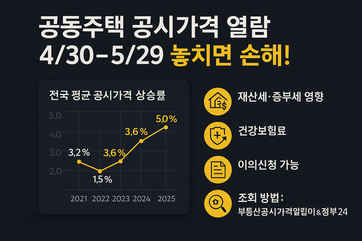 2025년 공동주택 공시가격 열람 및 이의신청 기간(4월 30일~5월 29일)을 놓치지 마세요. 내 주택의 공시가격을 확인하고, 필요하다면 이의신청을 통해 적정한 가격으로 조정받을 수 있는 소중한 기회입니다. 공시가격은 세금뿐만 아니라 다양한 사회보장제도의 기준이 되므로, 모든 공동주택 소유자는 반드시 확인하시기 바랍니다.