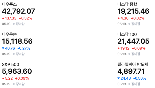 미국 증시는 신용등급 강등에도 불구하고 긍정적인 흐름을 보였습니다. 다우존스 산업평균지수는 0.32% 상승한 42,792.07, S&P 500 지수는 0.09% 상승한 5,963.60, 나스닥 종합지수는 0.02% 상승한 19,215.46으로 마감했습니다. 필라델피아 반도체 지수는 소폭 상승한 것으로 표시되어 있으나 등락률은 -0.50%로 표기되어 있어 혼란스러운 부분이 있습니다.