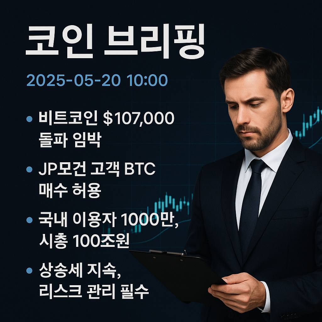 오늘 코인 시장은 비트코인의 10만7000달러 돌파, JP모건의 고객 비트코인 매수 허용, 미국 상원의 스테이블코인 법안 진전 등 긍정적인 요인들에 힘입어 강세 흐름을 이어갈 것으로 전망됩니다. 국내에서도 암호화폐 이용자 1000만 시대 도래와 시총 100조원 돌파로 시장이 성숙기에 접어들고 있습니다.