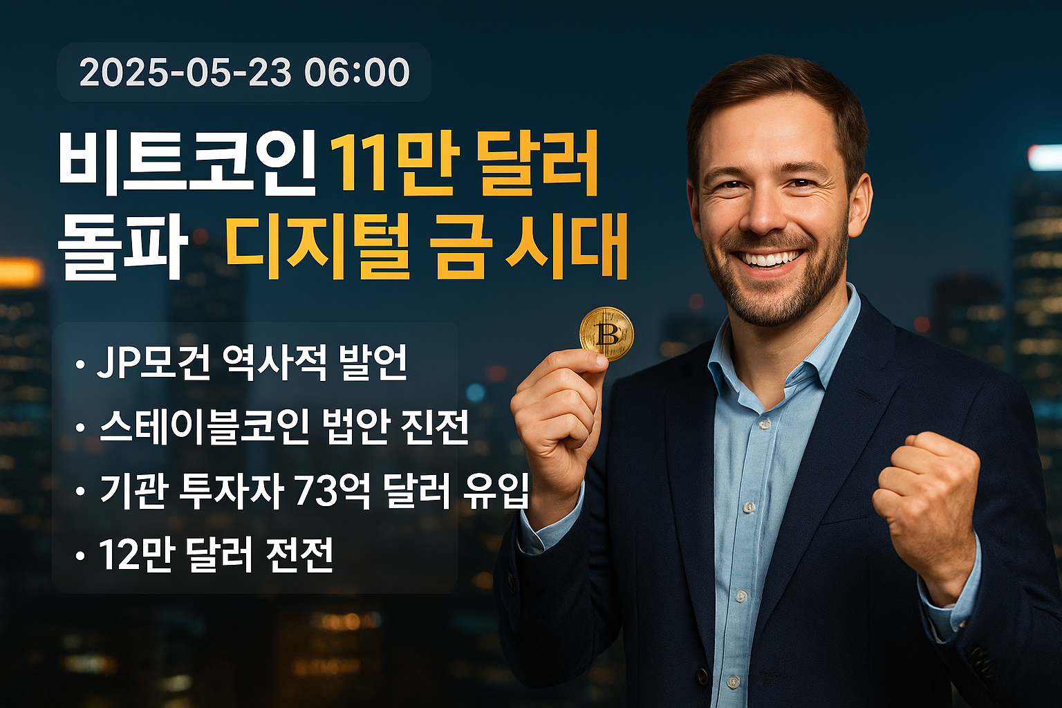 비트코인이 마침내 역사적인 11만 달러 선을 돌파했습니다! 어제(5월 22일) 암호화폐 시장은 비트코인의 사상 최초 11만 달러 돌파와 함께 강한 매수세가 유입되며 전반적인 상승 흐름을 보였습니다. 특히 JP모건 CEO의 "역사적 전환점" 발언, 미국 스테이블코인 법안 진전, 강력한 기관 투자자 유입이 비트코인 가격 상승을 뒷받침하고 있습니다. 오늘(5월 23일)은 이러한 모멘텀이 계속되며 12만 달러 돌파 가능성도 엿보이는 가운데, 주요 알트코인 시장도 동반 상승이 예상됩니다. 현재 미국과 한국의 증시가 혼조세를 보이는 상황에서도 암호화폐 시장은 독자적인 강세를 유지하고 있어, 달러 약세 환경과 글로벌 불확실성 속에서 비트코인이 '디지털 금'으로서 안전자산 지위를 확립해 나가는 모습입니다.