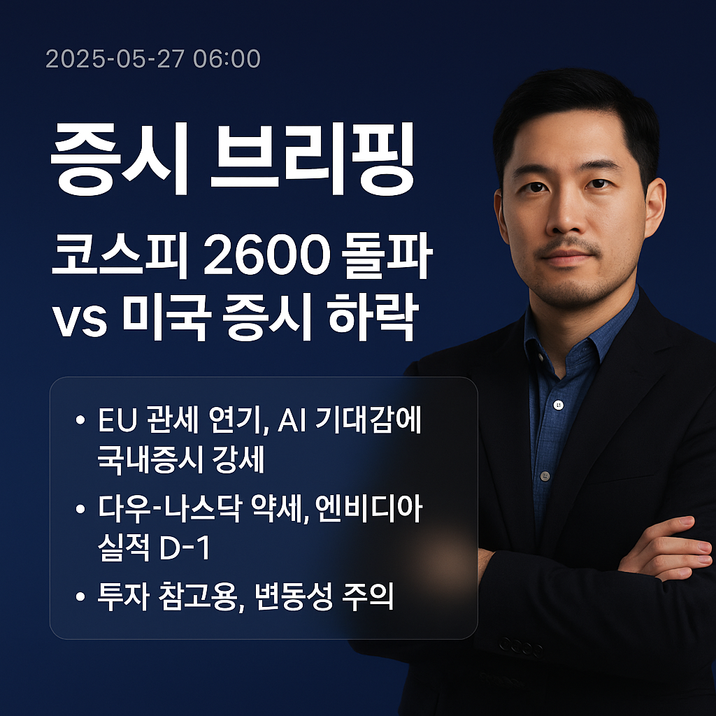 오늘 주목할 핵심 포인트는 트럼프 EU 관세 연기 발표 효과, 오픈AI 한국 법인 설립, 엔비디아 실적 발표 임박입니다. AI 분석 매수 추천 점수는 0.59로 중립에서 약간 긍정적 수준을 유지하고 있어, 제한적 상승 모멘텀이 예상됩니다.