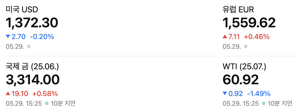 국제적으로도 5월 29일에는 위험자산에 우호적인 소식과 조정 요인이 혼재했습니다. 미증시는 기술주 강세에 힘입어 나스닥 지수가 상승 마감하고, 다우 지수와 S&P500 지수도 소폭 올랐습니다. 엔비디아를 비롯한 글로벌 기술기업들의 실적 호조가 투자심리를 끌어올린 반면, 도널드 트럼프 미국 대통령의 EU 대상 관세 부과 위협 소식은 다소 불안 요인으로 작용했습니다. 다행히 미 법원이 일부 관세 정책을 제동걸며 무역갈등 우려를 완화시켰고, 이것이 아시아 시장에도 긍정적으로 반영되었습니다. 미국 연방준비제도(Fed)는 추가 긴축보다는 금리 동결 기조를 유지하는 분위기여서, 통화정책 측면에서의 부담은 제한적입니다.