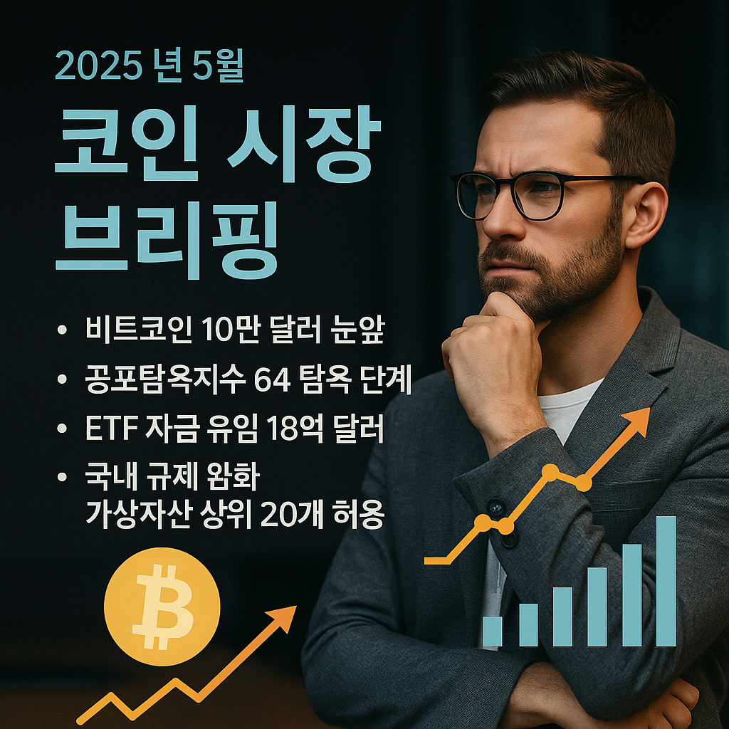 현재 암호화폐 시장은 연준 의장 발언을 앞두고 변동성이 확대되는 가운데도 상승 모멘텀을 보이고 있습니다. 암호화폐 공포탐욕지수 역시 한 달 전 ‘공포’ 단계(28)에서 현재 ‘탐욕’ 단계(64)로 크게 높아져 투자 심리가 개선된 모습입니다. 한국에서는 6월부터 비영리단체와 거래소가 가상자산을 제한적으로 판매할 수 있게 하는 법안이 확정되었고, 시총 상위 20개 코인으로 판매 대상을 제한하며 투명성을 강화하는 규제가 발표되었습니다. 해외에선 비트코인 현물 ETF에 5월 첫째 주에만 약 18억 달러의 순유입이 발생해 기관 수요가 견조함을 보여주고 있고, 금리 인하 기대감이 가격을 지지하는 등 단기적으로 상승 분위기가 우세합니다. 다만 대외 불확실성과 국내 규제 변화가 여전하므로 투자자들은 신중한 접근이 필요합니다.